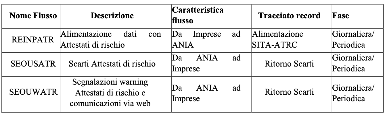 I flussi previsti per l’interscambio di informazioni fra ANIA e le Imprese sono riassunti nella tabella seguente.L’evidenza degli eventuali errori riscontrati in fase di caricamento sarà disponibile in formato elettronico secondo il tracciato di Ritorno scarti. I flussi che fanno riferimento al tracciato Ritorno scarti sono due: