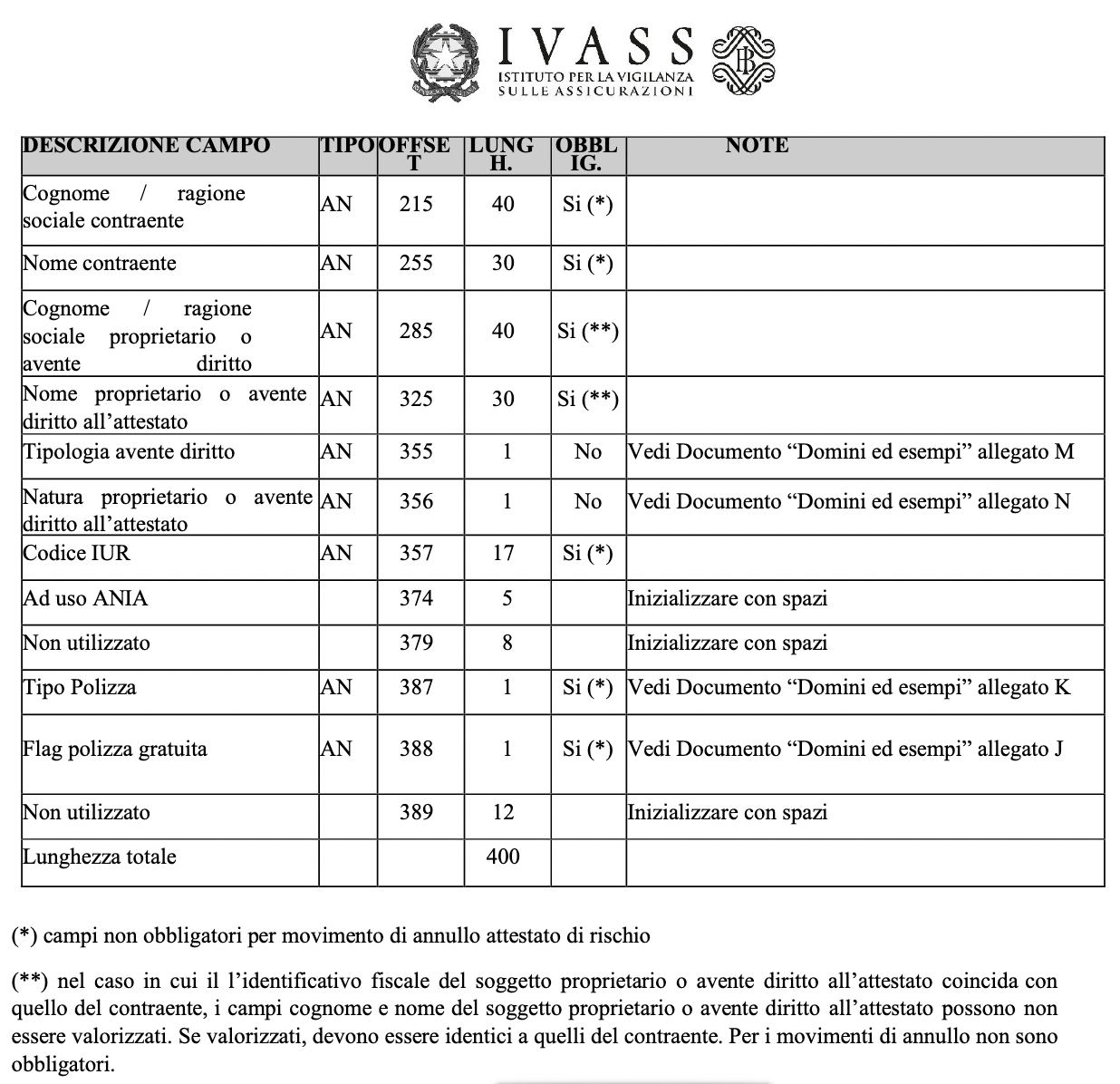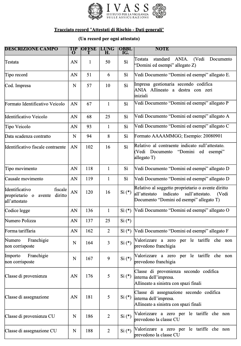 Le informazioni trasmesse per ogni attestato sono organizzate su tre tipi record diversi collegati tra di loro con alcuni campi chiave che identificano il veicolo, la scadenza contratto ed il contraente dell’assicurazione. La chiave permette di identificare in modo univoco un attestato, consentendo quindi di non caricare doppie posizioni, se non previo annullamento dell’attestato emesso in precedenza.