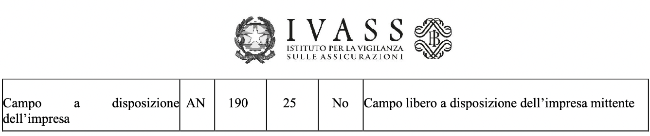 - Cod. Impresa: codice ANIA dell’impresa. L’informazione deve essere allineata a destra con zeri iniziali.