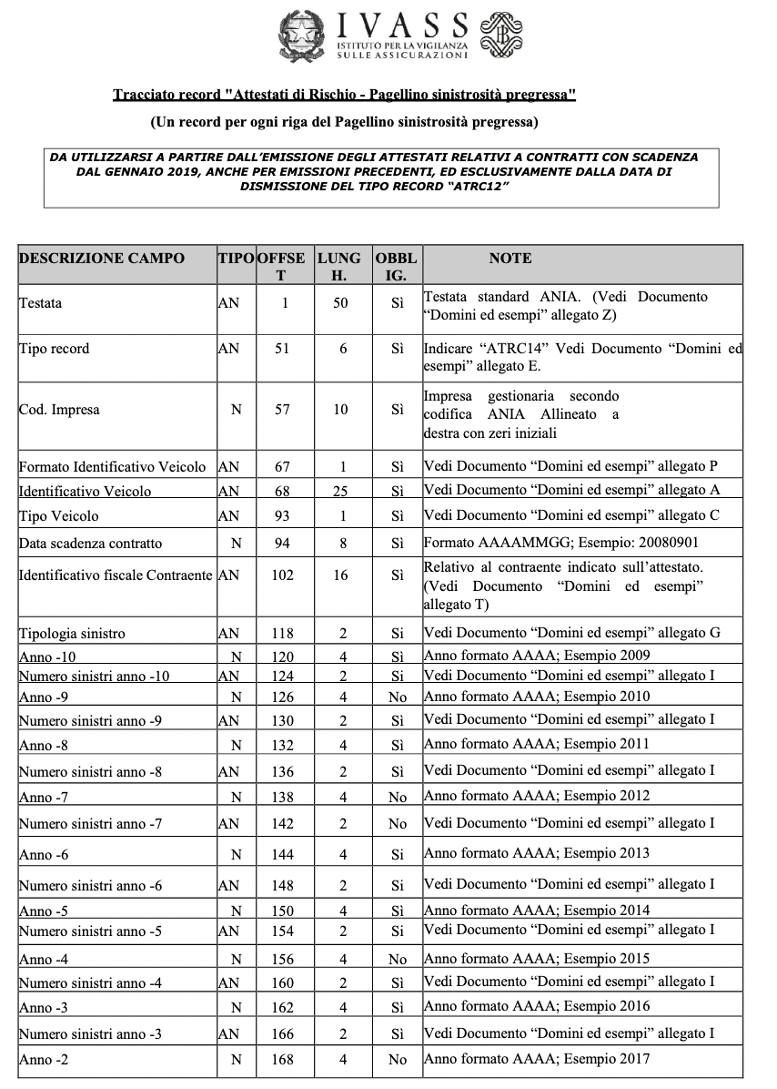 In ogni record (T.R. “ATRC14) sono previste undici ricorrenze: ogni ricorrenza corrisponde ad una delle undici annualità da indicare nel pagellino (la prima e l’ultima possono infatti essere frazioni dei rispettivi anni, e devono essere entrambe indicate in modo da raggiungere il totale di dieci annualità complete previsto dalle norme comunitarie). In ciascuna ricorrenza si deve valorizzare l’anno di riferimento e il relativo numero disinistri o in alternativa i codici previsti nei casi di “non assicurato” oppure “non disponibile”.