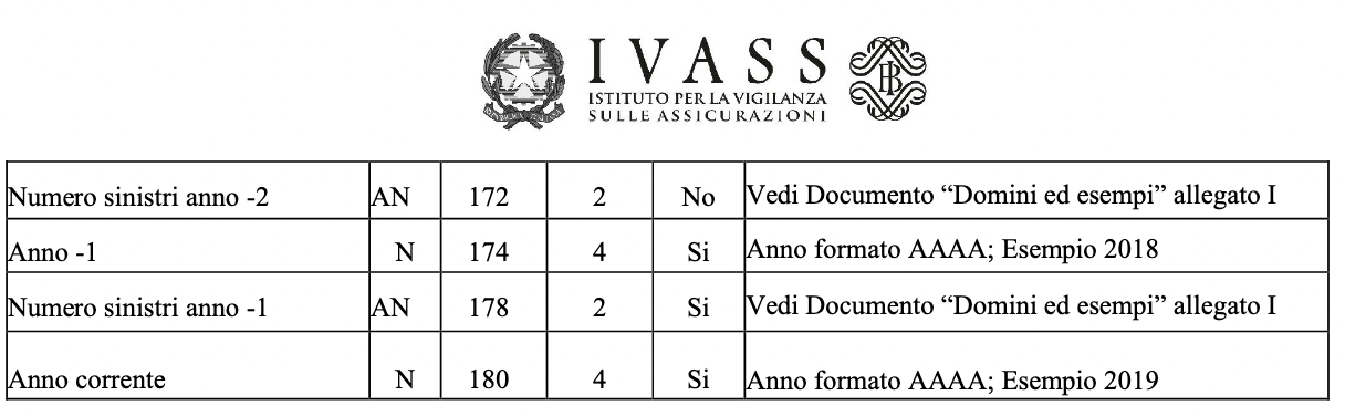 - Numero sinistri anno -7: contiene il numero di sinistri pagati in riferimento all’anno solare che precede di 7 anni quello di scadenza del contratto, per la tipologia di sinistro indicata (vedi Documento “Domini ed esempi” allegato I).