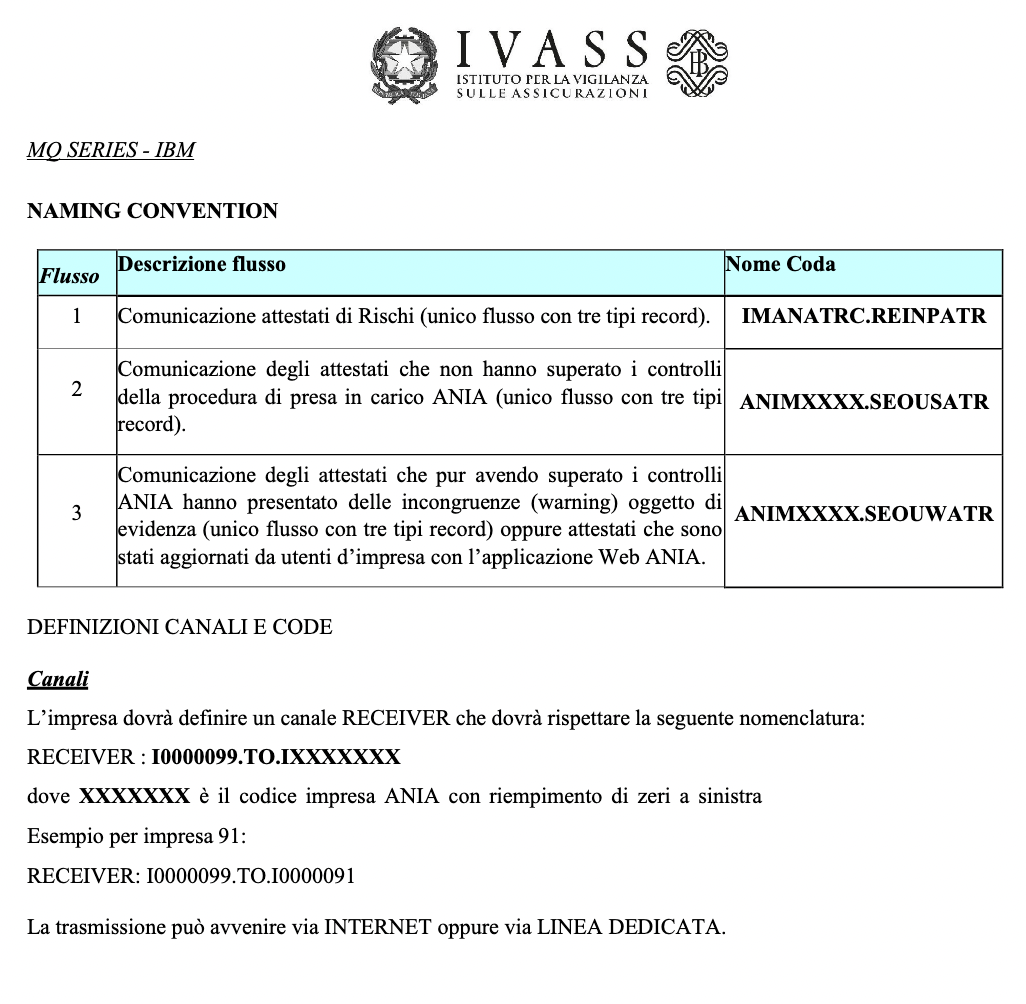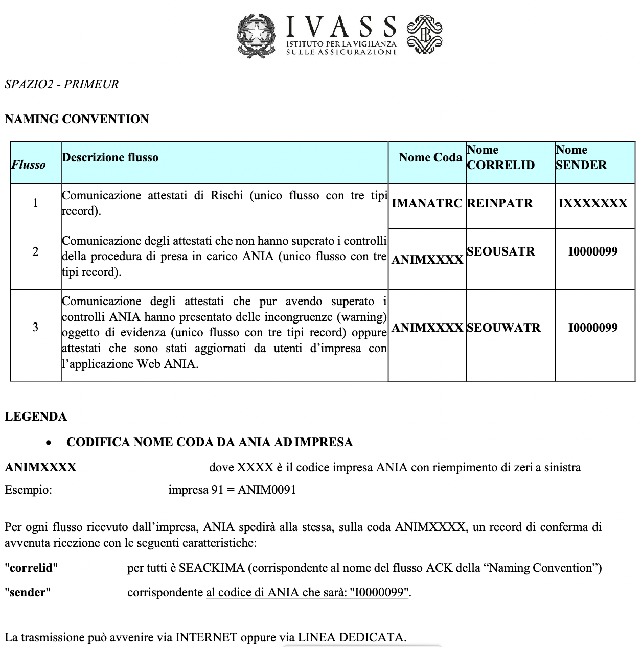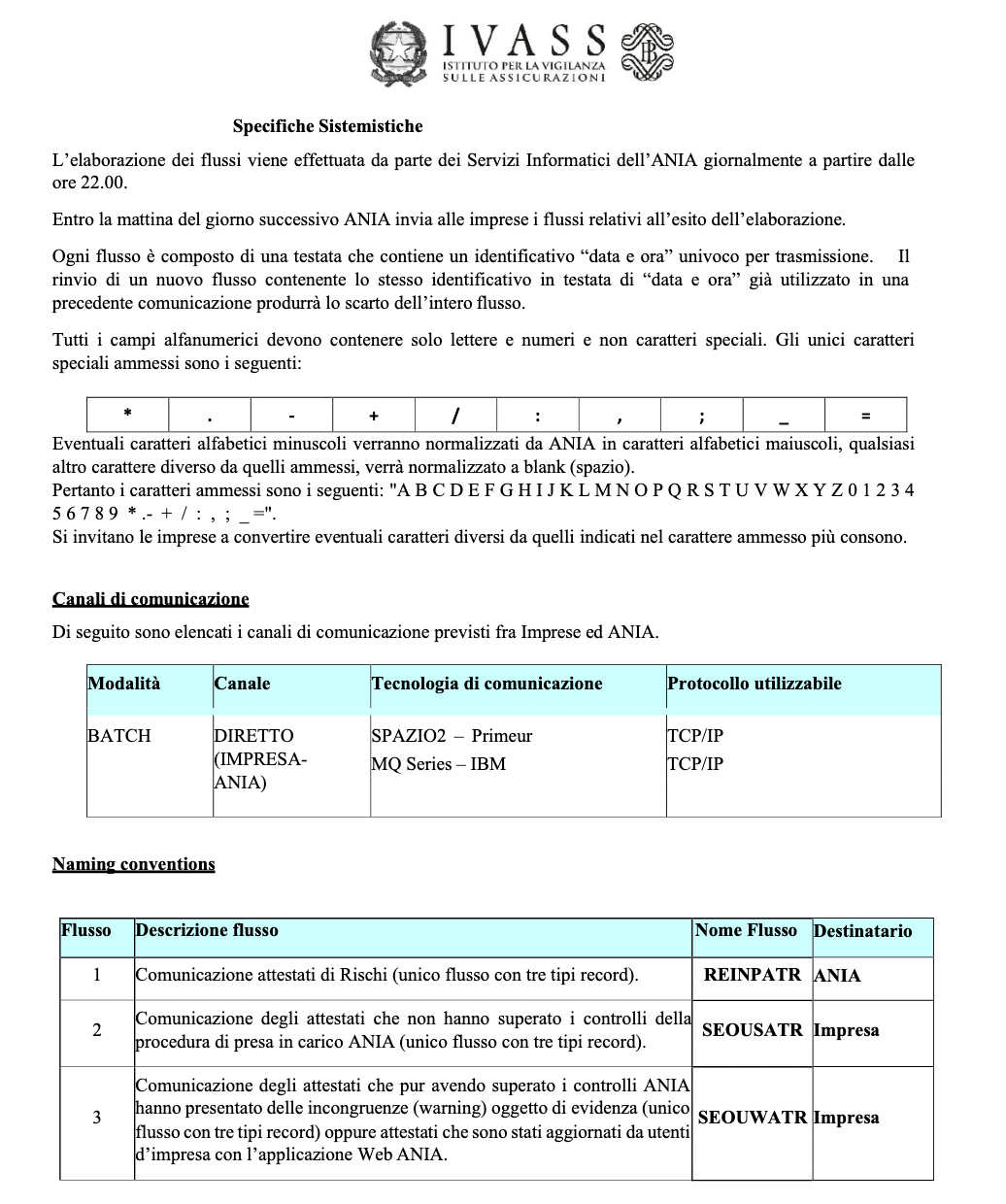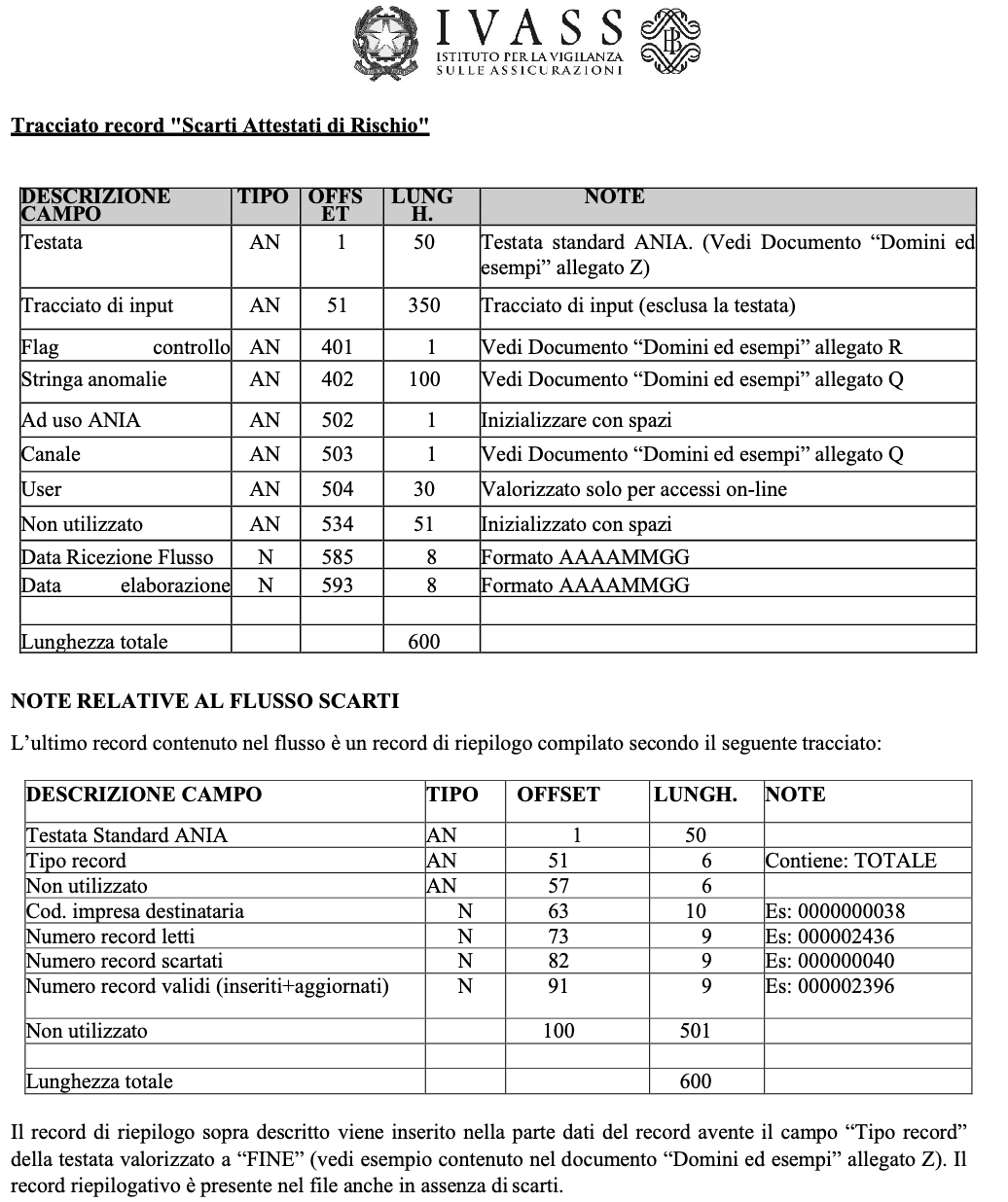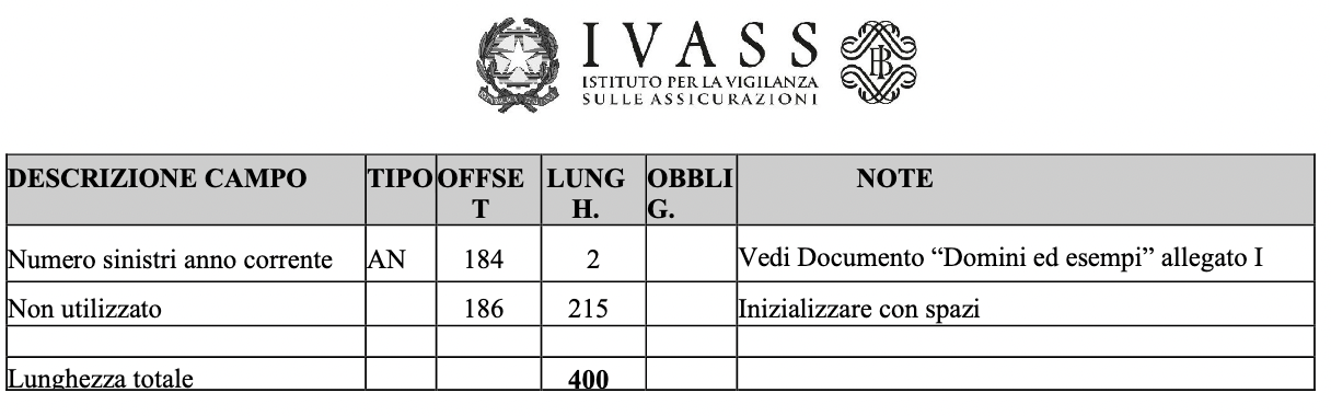 - Testata: testata Standard ANIA. Informazioni per il controllo e la gestione delle informazioni (vedi Documento “Domini ed esempi” allegato Z).