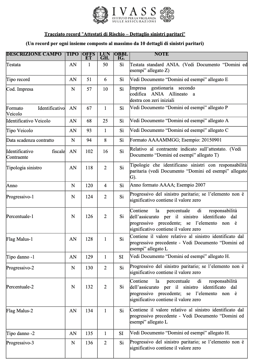 Ogni comunicazione dovrà comprendere sempre l’insieme dei primi due tipi record ed eventualmente del terzose esistono sinistri paritari. In caso di incongruenza verrà scartata l’intera famiglia di record.