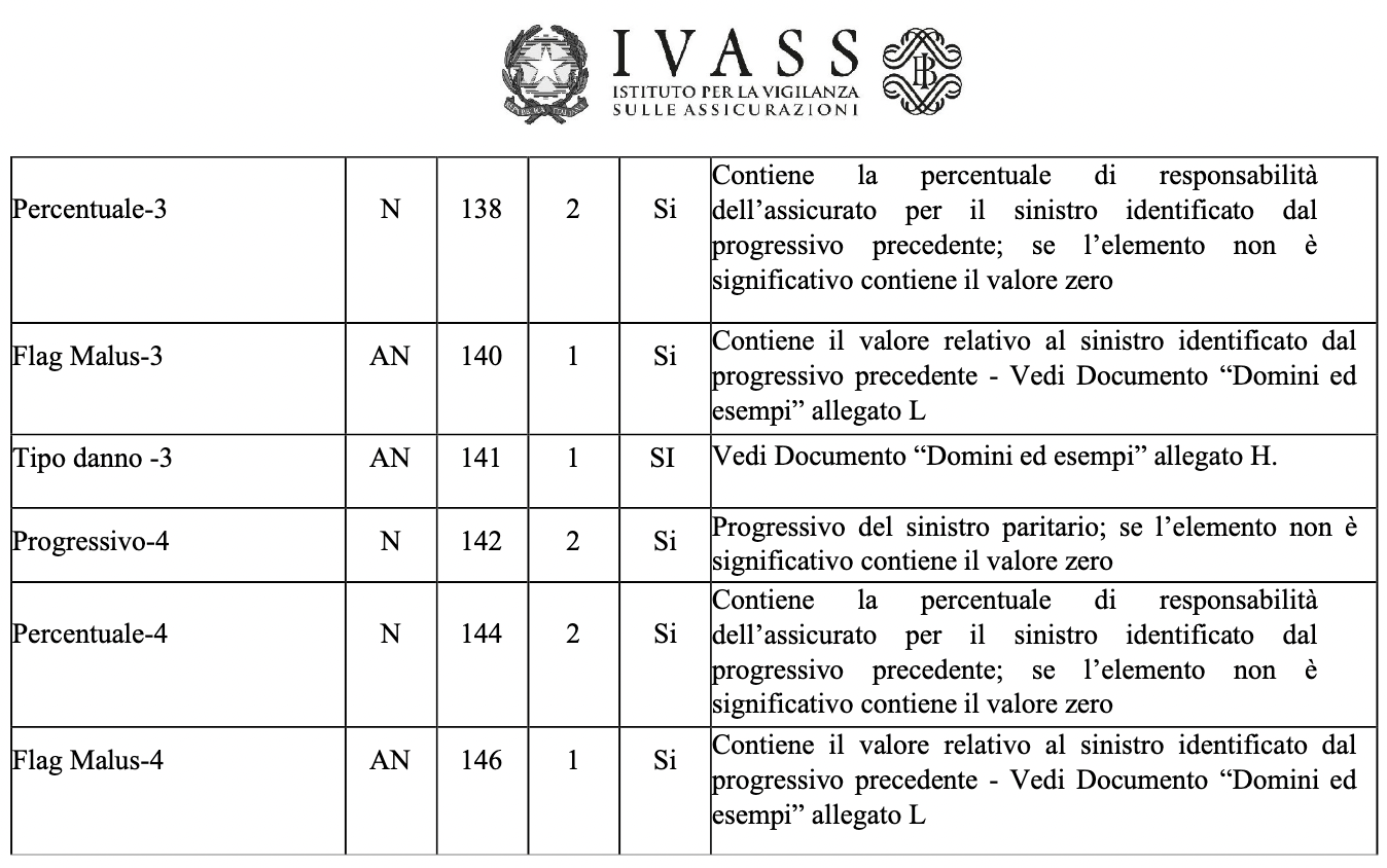 - Numero sinistri anno -4: contiene il numero di sinistri pagati in riferimento all’anno solare che precede di 4 anni quello di scadenza del contratto, per la tipologia di sinistro indicata (vedi Documento “Domini ed esempi” allegato I).