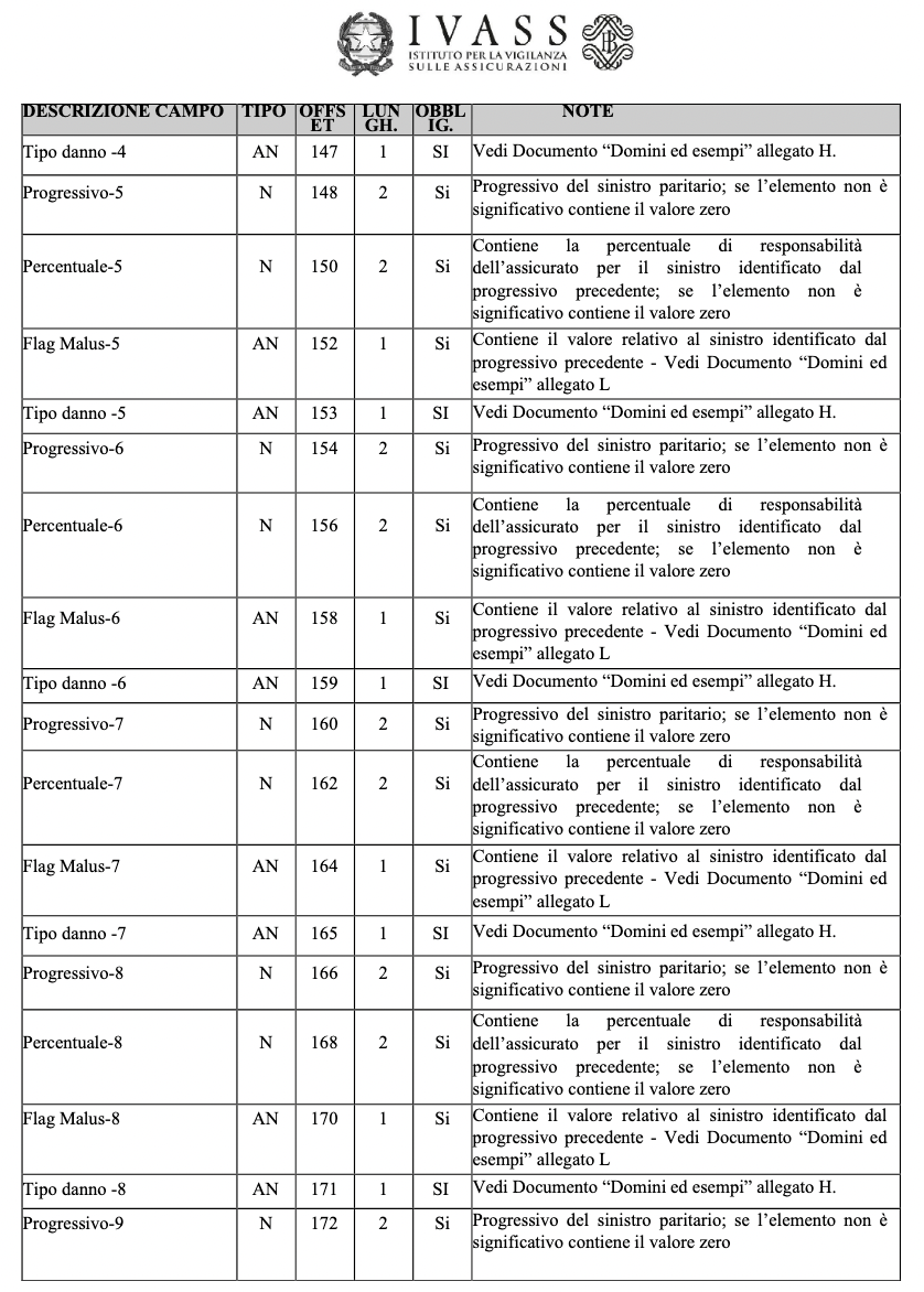 - Numero sinistri anno -8: contiene il numero di sinistri pagati in riferimento all’anno solare che precede di 8 anni quello di scadenza del contratto, per la tipologia di sinistro indicata (vedi Documento “Domini ed esempi” allegato I).