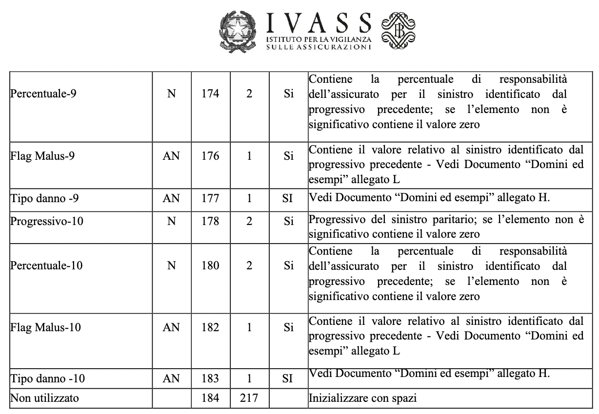 - Numero sinistri anno -9: contiene il numero di sinistri pagati in riferimento all’anno solare che precede di 9 anni quello di scadenza del contratto, per la tipologia di sinistro indicata (vedi Documento “Domini ed esempi” allegato I).