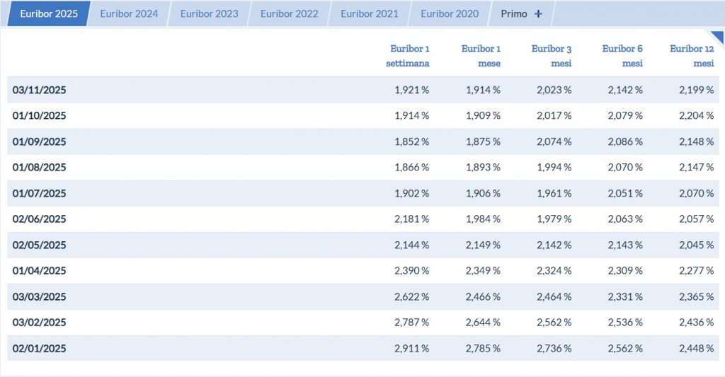 - Settembre 2025: L’Euribor a 12 mesi si attestava al 2,027%